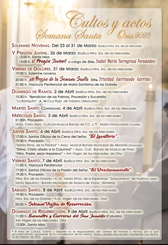 El Área de Cultura, Turismo y Deporte no se responsabiliza del cambio de horarios o fechas, por lo que recomiendanda cerciorarse de la actualizacion de los mismos. Datos cedidos tras reunión mantenida con fecha: 23 de Febrero de 2023